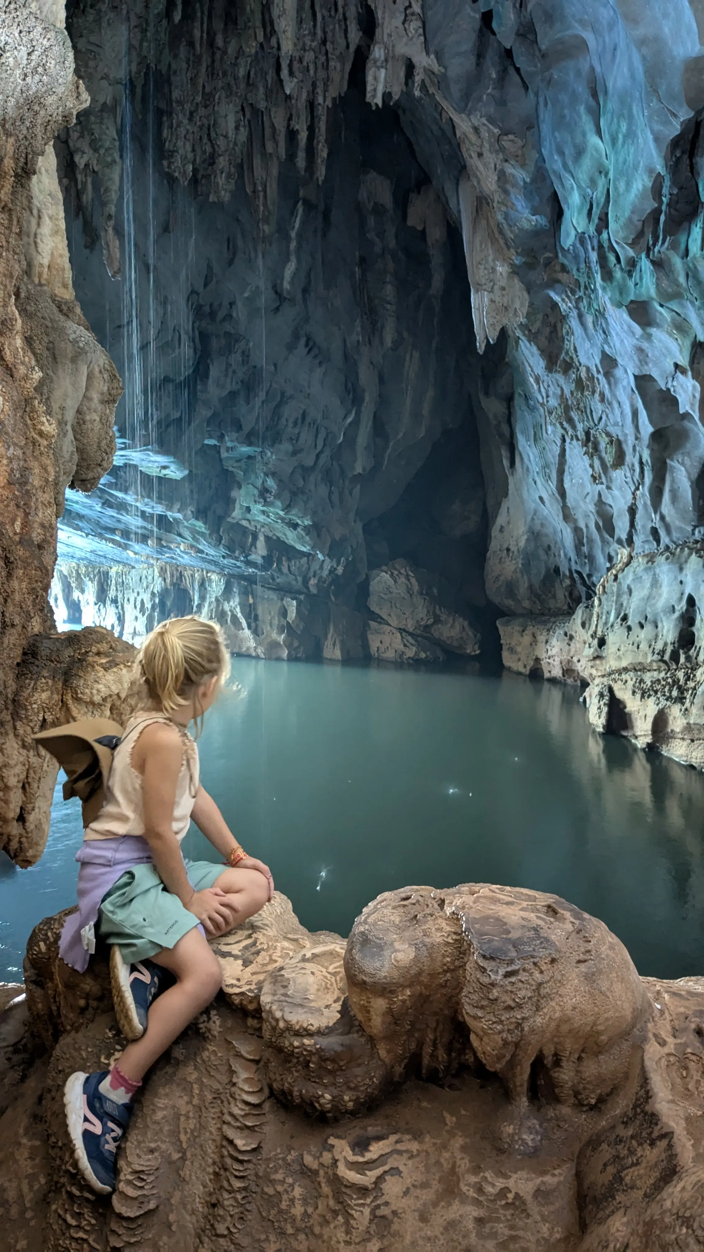 Après la partie en bateau, nous marchons à travers des formations rocheuses impressionnantes. Les stalactites et stalagmites sculptées par l’eau créent des paysages magnifiques !