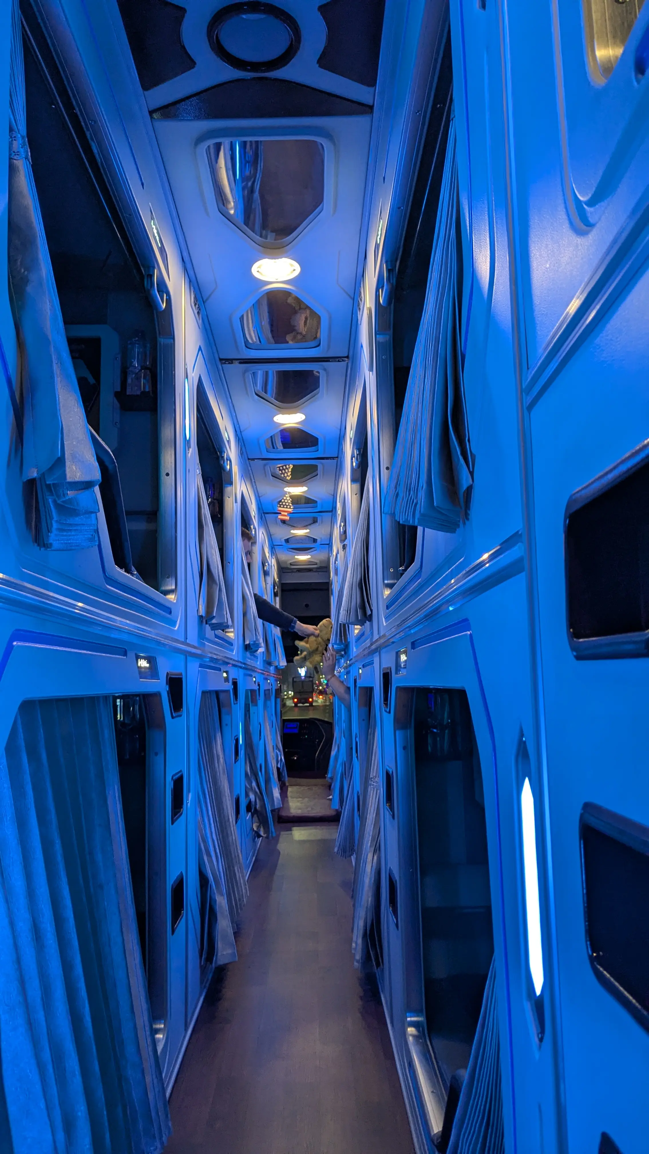 Après une bonne pizza (et un chauffeur en retard), on attend tranquillement, pensant avoir tout notre temps… jusqu'à ce que l’agence nous appelle presque en panique : "Come back NOW, the driver is here!". On embarque rapidos dans ce bus couchette futuriste, où chacun a sa propre cabine, équipée d’un matelas, d’une couverture et de lumières néon bleues qui donnent une ambiance digne d’un film de science-fiction.