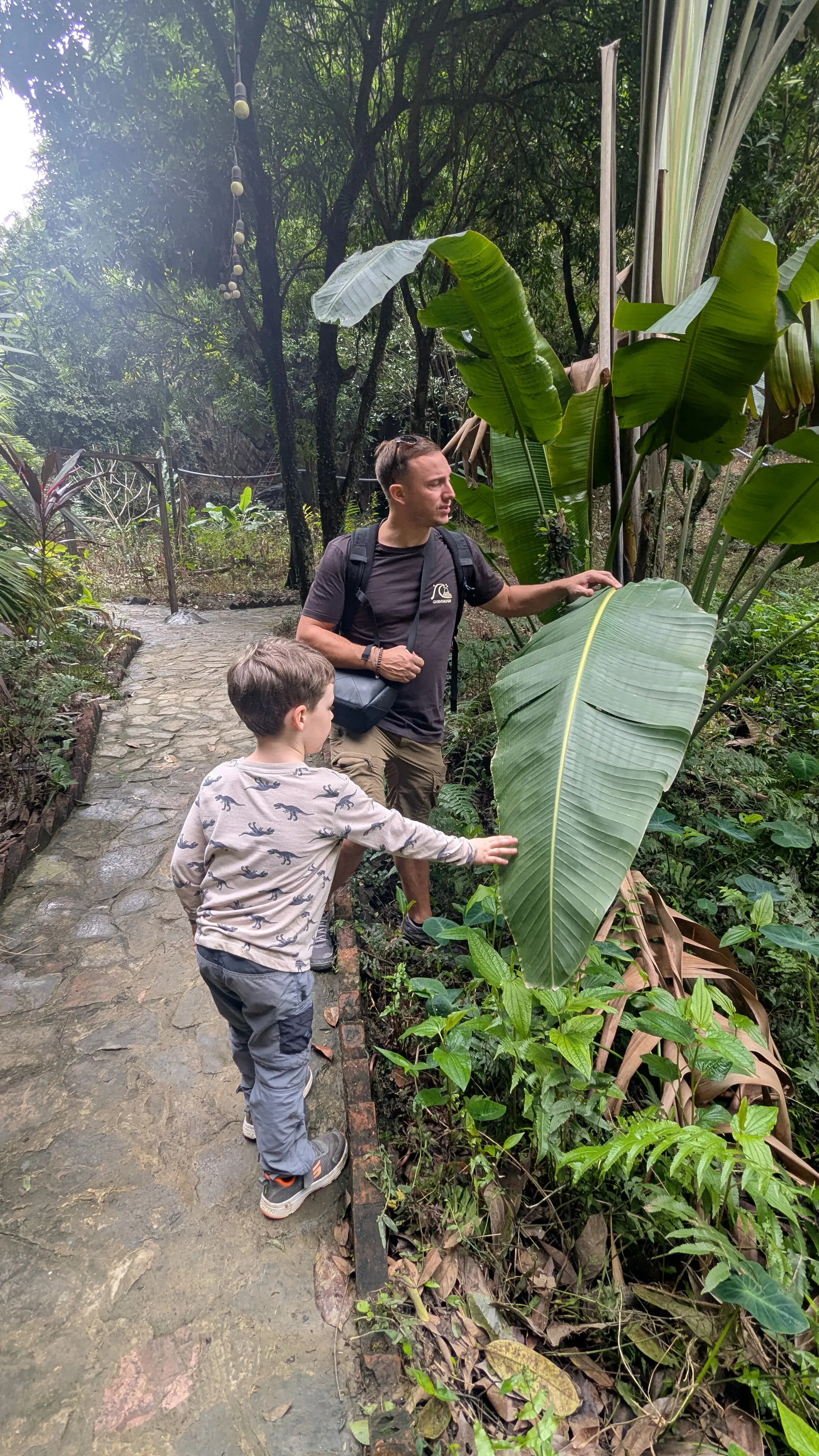 Pas le choix, il faut marcher 20 minutes sous la fine pluie pour rejoindre le point de rendez-vous. Les enfants avancent comme si de rien n’était, pendant que nous, on jongle entre les sacs et les trottoirs vietnamien. Finalement, tout est bien qui finit bien : on retrouve notre van privé (merci Tour Julie !), on balance les sacs dans le coffre, et on tente une micro-sieste, car on a encore une heure de route avant d’arriver à Phong Nha.